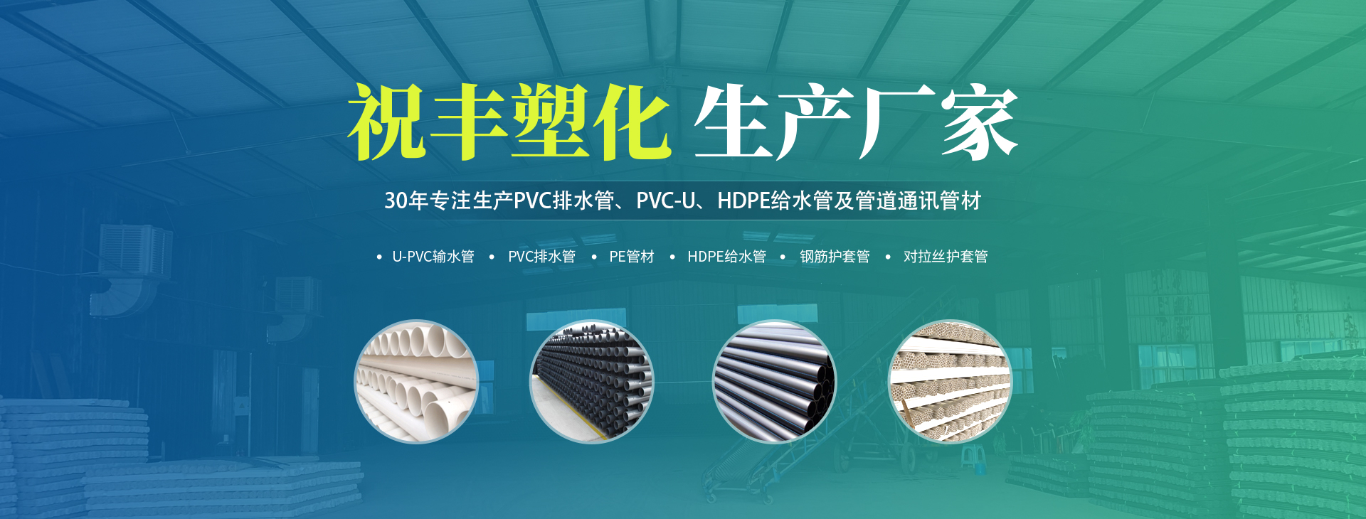安陽(yáng)市祝豐塑化有限公司坐落在滑縣工業(yè)園區(qū),東臨大廣高速,西臨京珠高速,是鄭州、鶴壁、安陽(yáng)、濮陽(yáng)四個(gè)城市的輸紐,交通便利、環(huán)境優(yōu)美。       公司始建于八十年代,經(jīng)過(guò)二十余年的艱辛創(chuàng)業(yè),規(guī)模不斷壯大,由十多萬(wàn)元資產(chǎn)的小廠(chǎng),發(fā)展到現(xiàn)占地面積達(dá)一萬(wàn)多平,建筑面積一萬(wàn)平,資產(chǎn)2000多萬(wàn)元管材生產(chǎn)企業(yè)。公司生產(chǎn)PVC-U、PVC排水管、HDPE給水管、鋼筋護(hù)套管管道通訊管材等產(chǎn)品,廣泛用于農(nóng)田節(jié)水、高山引水、人畜用水、建筑、電力通訊等多種用途,品種齊全。為了滿(mǎn)足用戶(hù)需求,可承攬各種給水、節(jié)水、灌溉工程。“祝豐塑化”憑借強(qiáng)勁的實(shí)力,優(yōu)良的管理水平。“以質(zhì)量求生存,以信譽(yù)求發(fā)展”的原則全力以赴和大家共同塑造美好未來(lái)。..